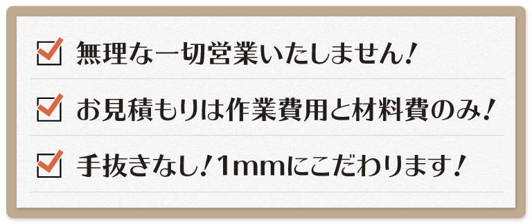 大切にしています。お見積もりに関しては、各社様々です。当店の強みは「ご提案・お見積り→工事→アフターサービス」まで一貫して当店が責任を持ってやり抜く体制です。下請けに仕事を流したり担当者が変わることもありません。お見積もり価格も品質とコストのバランスを第一にして、削減したコストはお客様のお見積もりへ還元しております。更に、悪徳訪問販売業者にありがちな「売ったら終わり」ということではなく、工事が終わってからのお客様とのお付き合いを大切にしています。くれぐれも「ただ安いだけ」「ただ高いだけ」のお見積もりで満足してしまわないようご注意くださいませ。